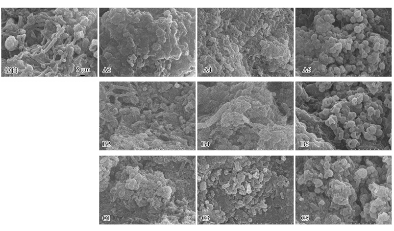 根據(jù)3.1節(jié)中的COD去除率變化選擇具有代表性的濃度組(A組:A2、A4、A6;B組:B2、B4、B6;C組:C1、C3、C5)進(jìn)行各項(xiàng)指標(biāo)的測(cè)定.圖 2為放大10000倍后的顆粒污泥的掃描電鏡圖.由圖 2可見,空白組厭氧顆粒污泥表面幾乎為8~25 μm長(zhǎng)的桿狀菌,伴隨有少量的球菌,污泥表面凹凸不平孔隙交錯(cuò),是內(nèi)部微生物能量代謝的重要通道.在高濃度的亞硝氮、硝氮和氨氮(A6、B6和C5)作用下,厭氧顆粒污泥的表面結(jié)構(gòu)都發(fā)生明顯變化,污泥表面的主要細(xì)菌由桿狀菌變?yōu)榍驙罹瑤缀醪灰姉U菌.低濃度抑制作用下,污泥表面主要細(xì)菌為桿菌和球狀菌,且與空白組相比桿菌比例明顯降低.
