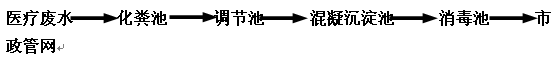 污水由排水系統收集后,進入污水處理站的化糞池,厭氧分解其中的糞便及大分子有機物,然后進入調節池,進行均質均量,調節池中設置液位控制器,再經液位控制儀傳遞信號,由提升泵送至混凝沉淀池,加藥絮凝沉淀之后,流入消毒池進行消毒處理,消毒出水直接排入市政管網。