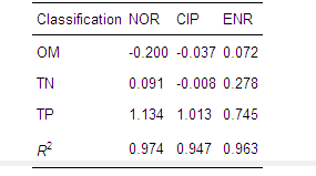 對NOR、CIP及NOR含量與OM、TN、TP進行多元線性回歸分析(見表 2),sig均小于0.001,R2在0.947~0.974間,回歸方程有效,回歸模型與實驗得到的數據均吻合較好.從多元回歸分析中得出NOR、CIP及NOR含量主要取決于TP的含量(表 2).