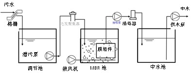 膜生物反應器(Membrane Bio-Reactor,MBR)是一種由膜分離單元與生物處理單元相結合的新型水處理技術,以膜組件取代二沉池,在生物反應器中保持高活性污泥濃度,減少污水處理設施占地,并通過保持低污泥負荷減少污泥量。該工藝主要利用沉浸于好氧生物池內的膜分離設備,截留槽內的活性污泥與大分子有機物。膜生物反應器系統內活性污泥濃度可達到8000-10000mg/L,污泥齡達到30天以上。膜生物反應器因其有效的截留作用,可保留世代周期較長的微生物,如硝化菌,系統內其硝化效果明顯,對深度除磷脫氮提供可能。MBR工藝基本構造如圖4所示。