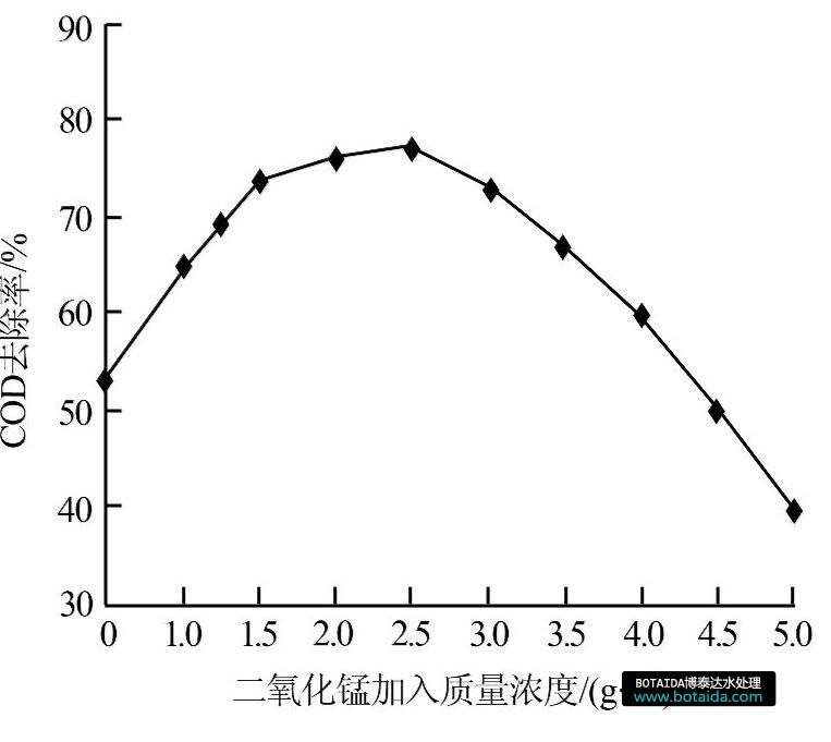 在pH=3.0,鐵炭總質量濃度20 g/L,鐵炭比3∶1,反應時間40 min,H2O2投加質量濃度為0.55 g/L條件下,分別加入0、1.00、1.25、1.50、2.00、2.50、3.00、3.50、4.00、4.50、5.00 g/L的MnO2,考察二氧化錳對微電解處理廢水體系的催化作用,結果如圖2所示。