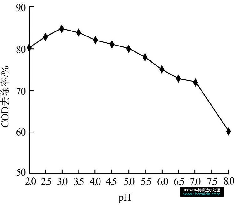 由圖4可以看出,在酸性條件下,隨pH的增加,廢水COD去除率增加,在pH=3.0時有最佳效果。當pH小于3.0時,鐵屑與酸反應生成的氫氣大量覆蓋在鐵屑的表面,減小了鐵屑的有效表面積,降低了原電池效應,從而使處理效果下降。而且溶液pH過低,會破壞絮凝體,使溶液因Fe2++和Fe3++濃度增大而色度增加。當pH大于3.0時,H+濃度逐漸降低,陰極的反應效果也下降。所以選擇適宜的進水pH為3.0。