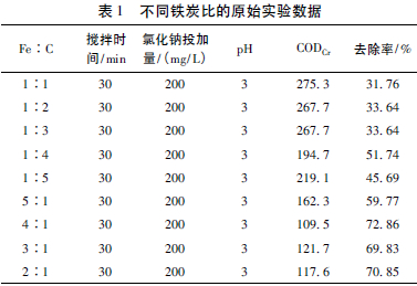 控制其他反應條件不變,氯化鈉投加量為200 mg/L,pH值為3,攪拌時間為30 min,將鐵的投加量固定為20 g/L,在不同的鐵炭比(Fe∶C=5∶1、4∶1、3∶1、2∶1、1∶1、1∶2、1∶3、1∶4、1∶5) 條件下進行反應。測定各水樣CODCr值,計算CODCr的去除率,結果見表1。