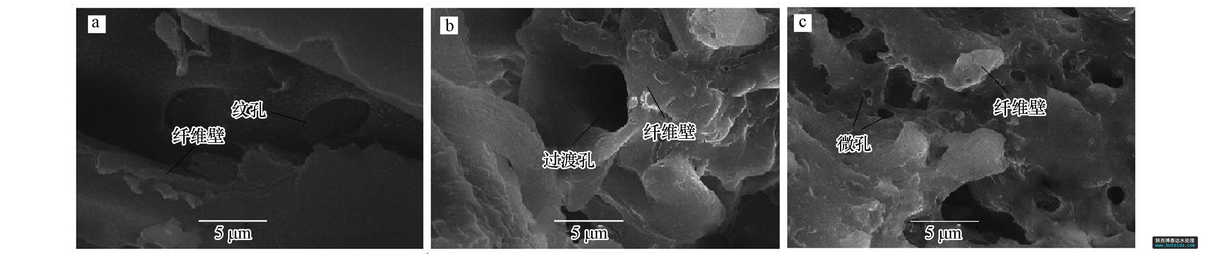 用JSM-6380LV掃描電鏡對原木粉、芐基化木粉、多微孔芐基化木粉進行了分析(圖 4).對比原木粉(圖 4a)和芐基化木粉(圖 4b)發現,原木粉中封閉的紋孔清晰可見,纖維壁堅硬、平整.原木粉經芐基化改性后(圖 4b),紋孔膜破裂,纖維壁膨松、柔軟,過渡孔清晰可見.芐基化木粉經水熱處理后得到多微孔芐基化木粉(圖 4c),纖維壁明顯破裂,產生了許多微孔.這一方面是由于水蒸汽分子具有高能量、高穿透力,可將芐基化木粉纖維壁上的微纖絲部分沖破,并造成斷裂,產生新的微孔或超微孔(王瑀,2008);另一方面,在高熱水蒸汽分子沖擊下,芐基化木粉結晶區中纖維素的氫鍵斷裂,纖維分子從彎曲狀態變成伸展狀態,纖維壁伸展開來,產生了明顯的“膨化效應”,有效地擴大了芐基化木粉的過渡孔和微孔.此外,水熱處理中所加乳化劑OP-10能迅速乳化從纖維壁間釋放出的膠狀物質,有利于及時清洗疏通孔道.由此可見,木粉經芐基化及水熱處理后,木材纖維壁變得膨松,產生大量的微孔或超微孔,有效地擴大了芐基化木粉吸附重金屬離子的比表面積,同時使纖維素和半纖維素分子上的羥基更加裸露,增加了對重金屬離子絡合的羥基數目,從而提高了對重金屬離子的吸附性能.