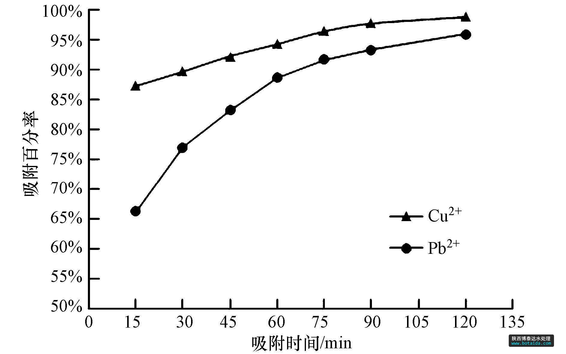 圖8 吸附時間對Cu2+和Pb2+吸附百分率的影響