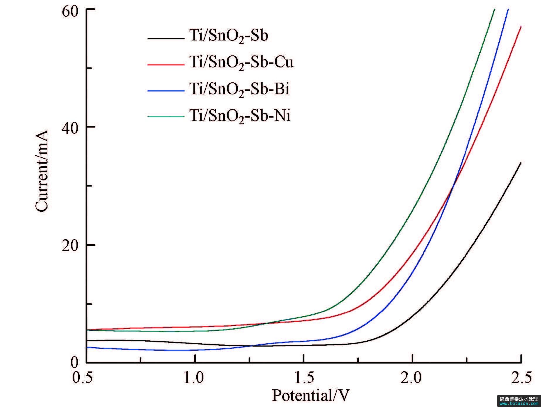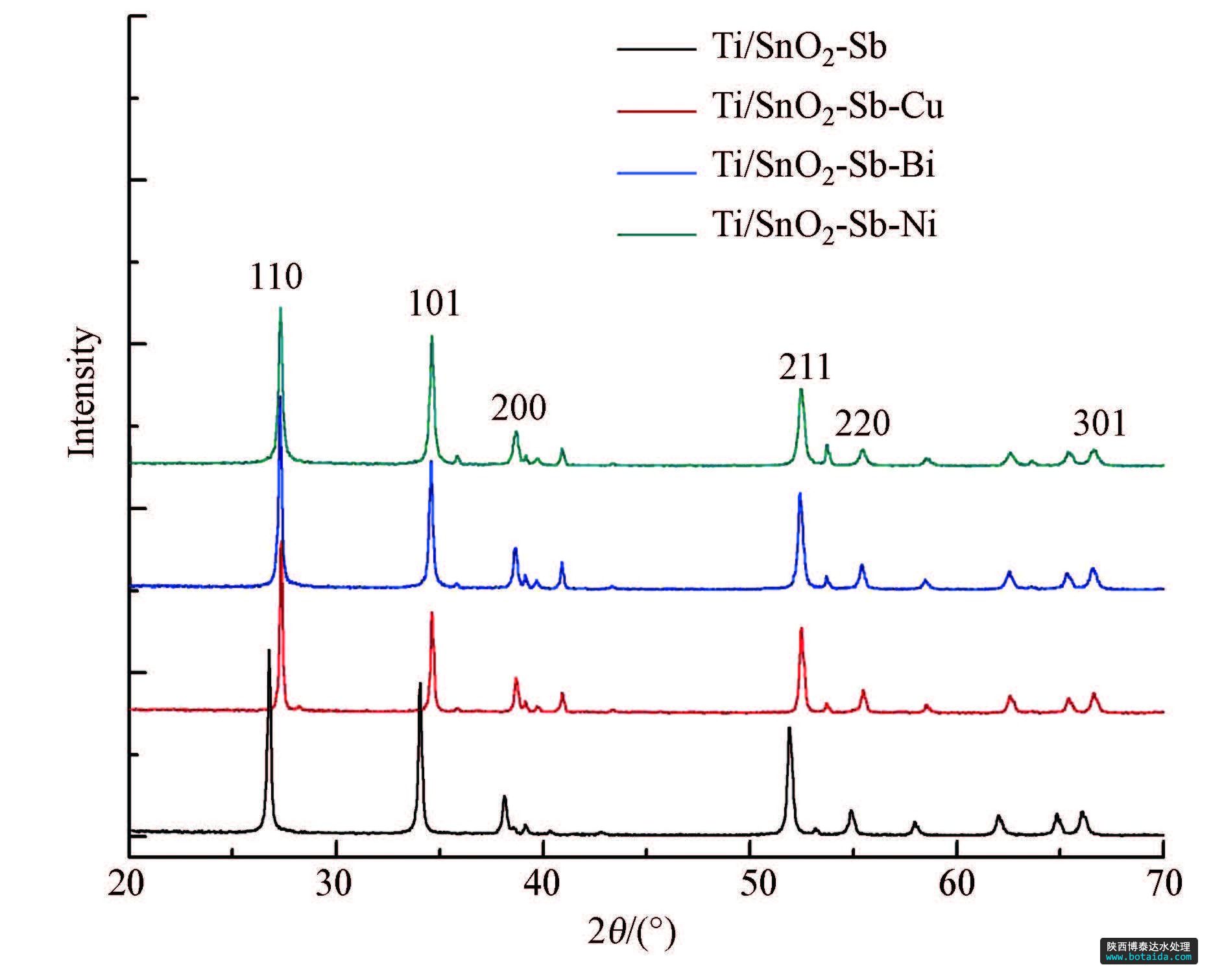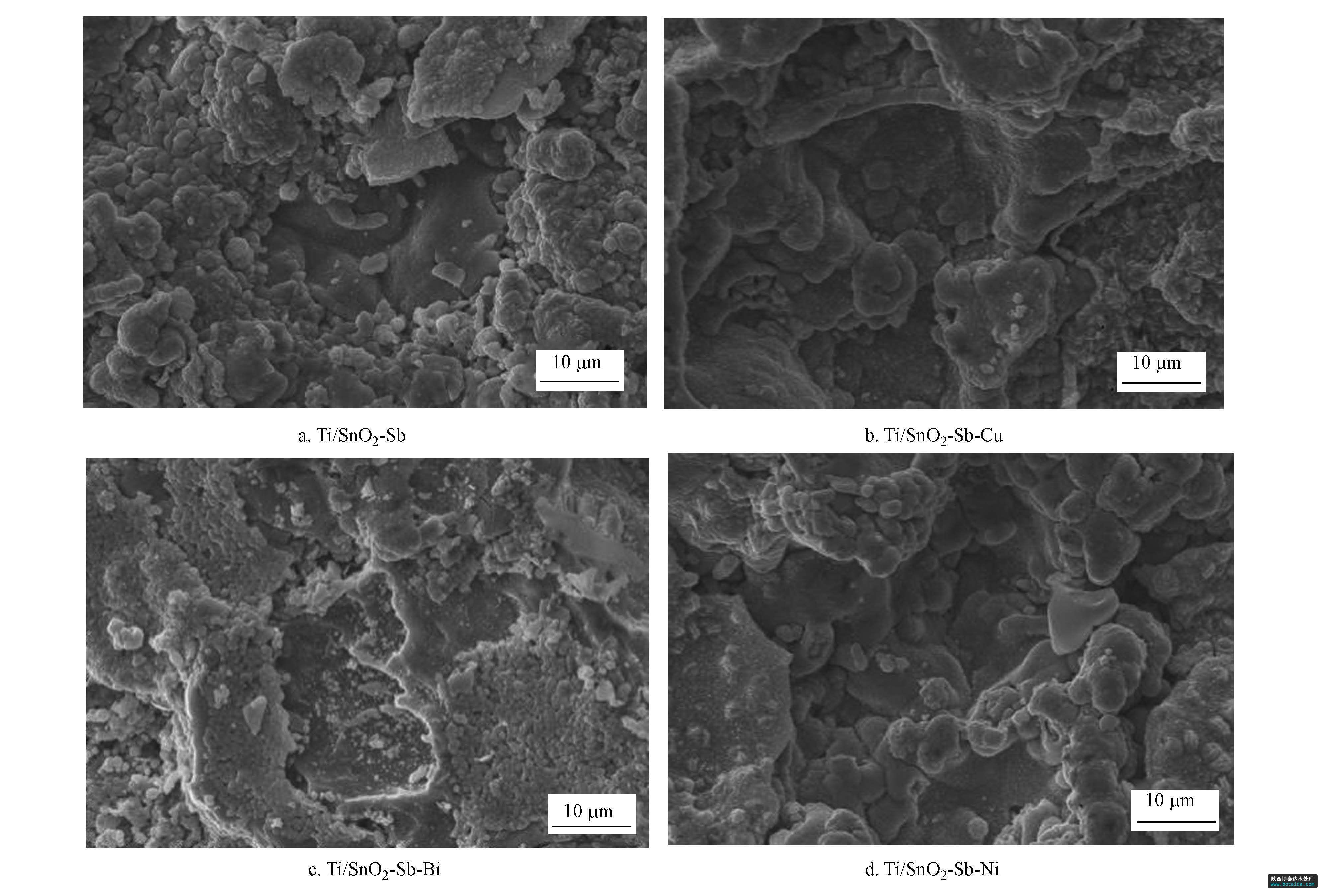 同時從所有電極的XRD圖譜中也沒有發現有鈦基體的特征峰出現,說明所制備電極的表面已經 完全被二氧化錫微粒所覆蓋.這樣的結構避免電解 過程中產生的氧滲透到鈦基體,改變其界面的張力,造成活性涂層的脫落,影響電極的催化活性.