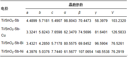 通過XRD分析軟件(X′Pert highscore plus)對數據進行分析(晉勇等,2008)得到各電極的晶胞參數見表 1,分析表中數據發現,對Ti/SnO2-Sb電極進行金屬摻雜改性后,晶胞參數發生改變,主要體現在晶胞體積的增大或減小,這是由于各金屬離子成鍵半徑不同,當金屬離子以固溶或者類質同相的形式取代Sn4+進入SnO2晶格內部,必然引起金屬氧鍵的鍵長發生變化,從而造成晶胞參數的改變.XRD圖譜和晶胞參數等數據表明,通過金屬摻雜改性使金屬離子進入到SnO2晶格中,其中,Cu和Ni以其p型半導體的性質形成了空穴點位(劉淼等,2013),使電極表面形成較為密集的蜂窩狀,微觀結構(圖 1)中也觀察到電極無裂縫且蜂窩狀結構分布均勻,這樣的結構可以增加電極的活性點位而提高電催化性能;而Bi則為n型半導體,與SnO2有著相似的性質,進入SnO2晶格后主要通過增加自由電子的濃度來達到增強導電能力的效果.