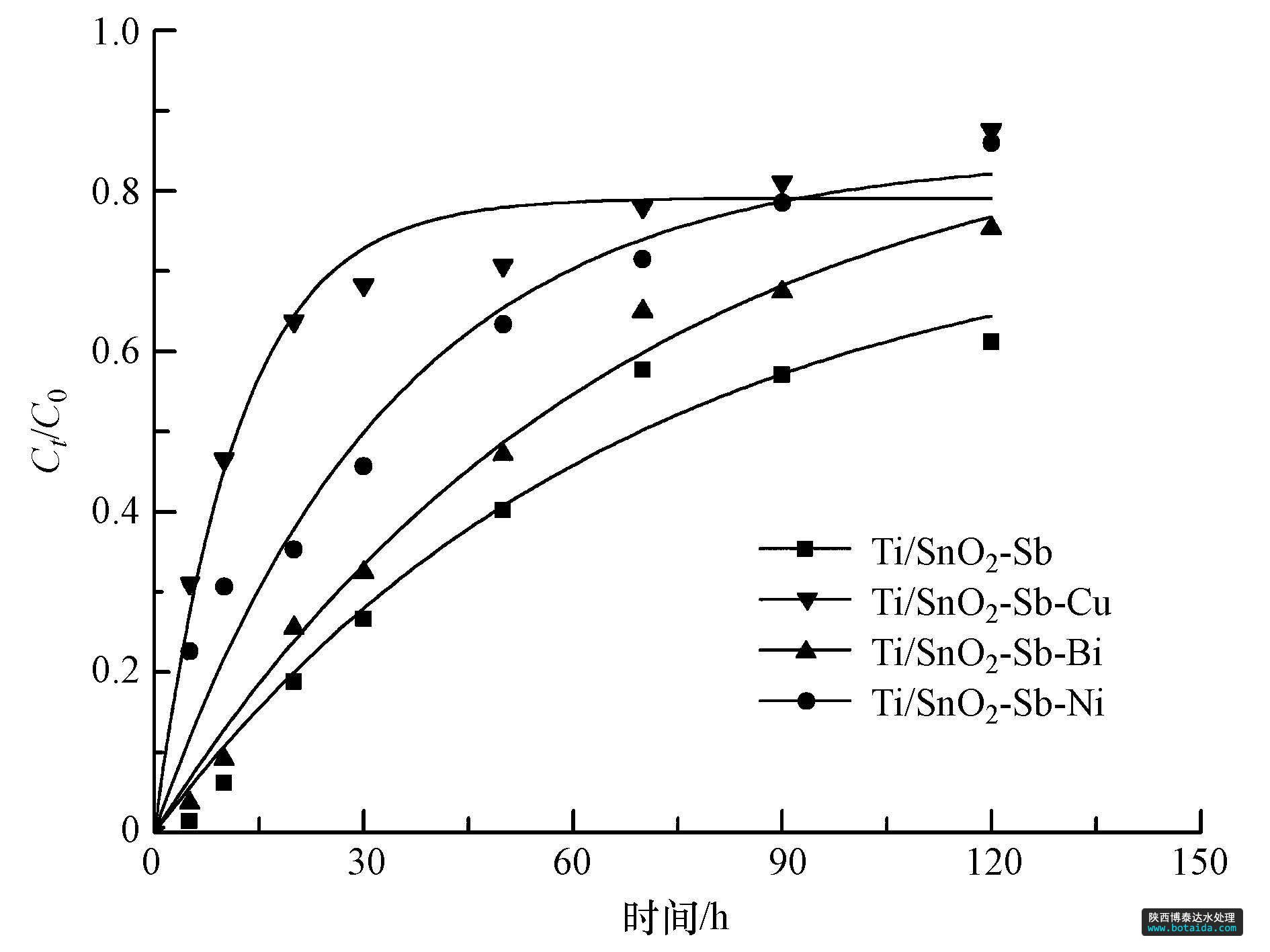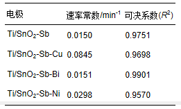 反應速率常數越大說明有機物的降解速率越快,從表中可以看出在相同條件下,p-DCB在各電極上的反應速率常數由大到小依次為KTi/SnO2-Sb-Cu,KTi/SnO2-Sb-Ni,KTi/SnO2-Sb-Bi,KTi/SnO2-Sb.因此p-DCB在Ti/SnO2-Sb-Cu電極上的降解速率最快,在Ti/SnO2-Sb電極上的降解速率最慢,可見金屬元素的摻雜對p-DCB的降解起到了促進作用。