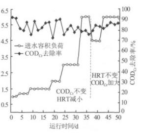 經過近 40 d 的培養馴化,當進水 CODCr 為 1 100 mg/L,HRT 為 24 h 時 ,CODCr 去 除 率 穩 定 在 92% 左右,進入運行特性試驗階段,該過程分 2 個階段提高進水容積負荷 。 CODCr 去除率隨進水容積 負荷的變化情況見圖 2。