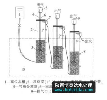 試驗裝置如圖 1 所示 ,MICR 由 3 根 D 80 mm× 1 000 mm 的有機玻璃管串聯而成,總有效容積為 12.81 L,分為 1#、2#、3# 反應室。各反應室均設 3 個孔徑為 8 mm 的取樣口,取樣口分別位于距離 反應室底部 100、350、700 mm 處,并用恒溫水浴槽控制試驗溫度為(35±1 ) ℃。 廢水從高位槽向 1# 反應室底部注入,然后由上部出水口經溢流堰順管道進入 2# 反應室底部,依次推進,經過 3# 反應室之后排出 。各反應室的氣體在集氣罩下方匯集,以泥水混合液的形式經提升管進入氣液分離器,氣體從排氣口排出,泥水混合液經回流管回流至反應室底部,形成液體內部循環 。