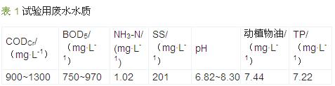 試驗所用乳品廢水取自廣西皇氏甲天下乳業股份有限公司 ( 主要水質參數見表 1 ),并根據需要添加了適量純牛奶,以提高 CODCr,以尿素為氮源 、磷酸二氫鉀為磷源,保持 m (CODCr) ∶ m (N) ∶ m (P) = 300 ∶5∶1 。為促進污泥馴化,適量添加含有 Fe、Ca、 Mn、Zn、Co、K 等微量元素的營養液。