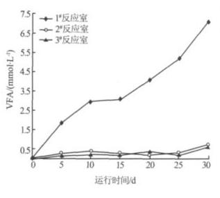 在厭氧消化過程中 ,甲烷菌主要利用 VFA 形成甲烷,因此 VFA 的積累程度及變化規律能夠很好地表征厭氧反應器的相分離狀態〔6〕。圖 5 為各反應室出水的 VFA 隨運行時間的變化情況。