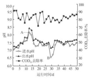 圖 3 進、出水 pH 及 CODCr 去除率隨運行時間的變化