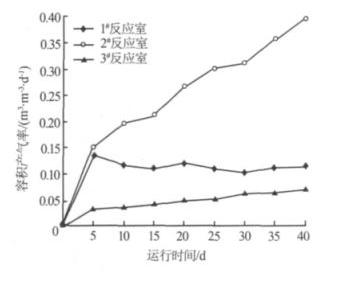 (2)MICR 存在產酸相與甲烷相分離現象。 1# 反應室出水 VFA 在 2.0 mmol/L 以上,2#、3# 反應室出水 VFA 僅在 0.25~0.75 mmol/L 之間變化 ; 2# 反應室產生 CH4 最多 ,容積產氣率最高可達 0.397 m3/(m3· d),研究表明 2# 、3# 反應室以產甲烷菌為主 ,1# 反應室以產酸菌為主。