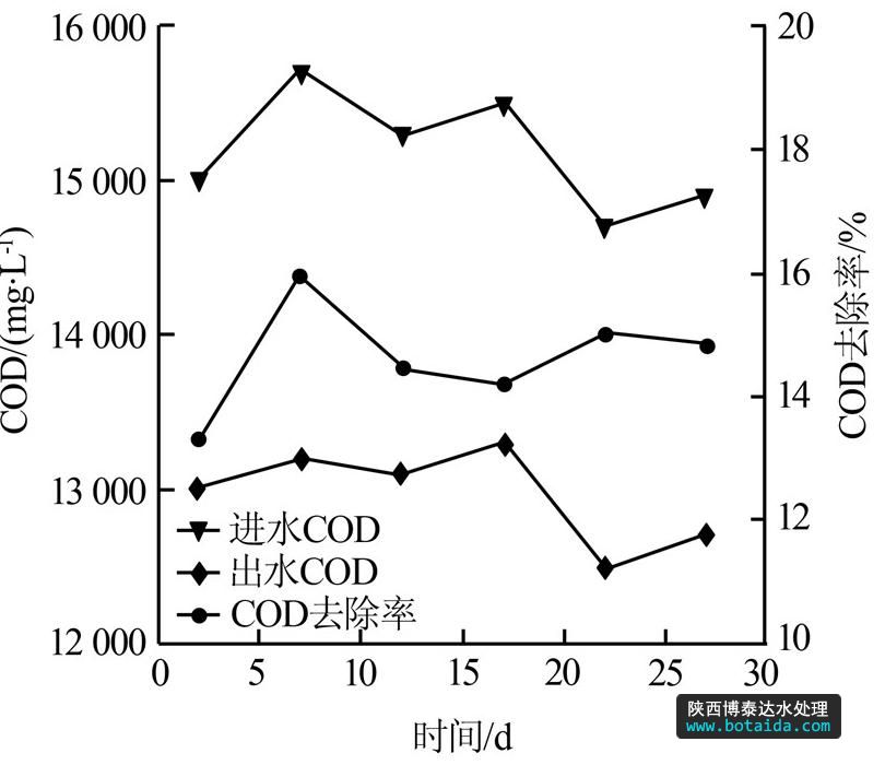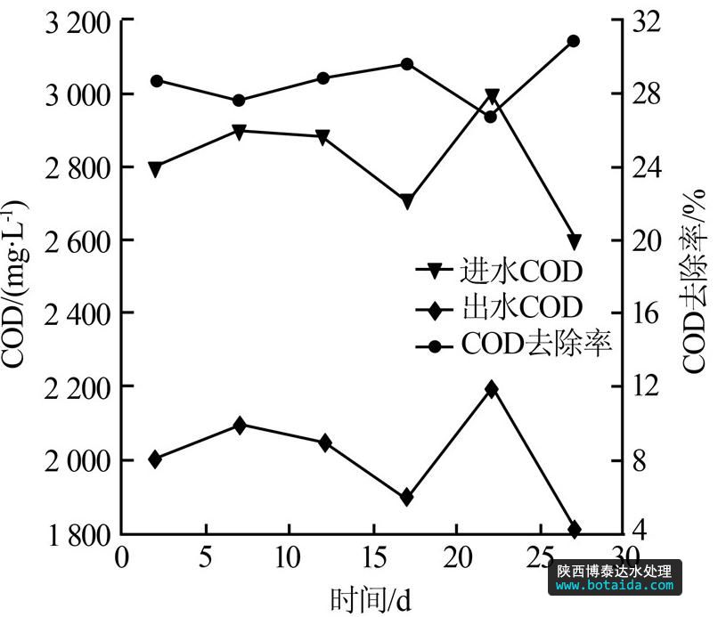 由圖 4可以看出,UASB工藝對COD的去除率基本穩定在30%左右,出水COD約為2 000 mg/L。
