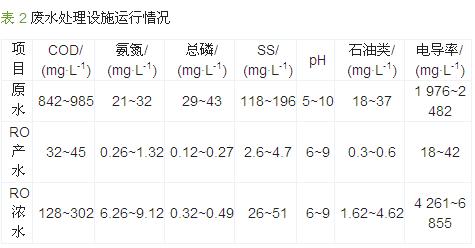脫脂廢水、磷化廢水、噴漆廢水和電泳廢水等機械加工廢水的有機物濃度較高,且含有礦物油、懸浮物和氮磷等污染物。通過氣浮和混凝沉淀處理可將COD降低到700 mg/L左右,生物系統(缺氧和好氧工藝)可將COD降低到70 mg/L左右,出水可穩定達標排放。實際運行時首先投加NaOH將廢水pH調至8.5~9.0,然后按照3、5、1.0 mL/L的投加量分別加入5%(質量分數,下同)的CaCl2溶液、10%的聚合氯化鋁和5%的聚丙烯酰胺溶液,混合反應60 min后進入氣浮池,氣浮出水按6、1.5 mL/L投加量分別投加10%的聚合氯化鋁和5%的聚丙烯酰胺溶液,混凝沉淀出水最后進入生物處理系統,生化出水經砂濾器、炭濾器、超濾、保安過濾器和反滲透深度處理后回用于生產,反滲透濃水可達到GB 8978—1996三級標準。該工程已穩定運行4 a多,從實際檢測結果來看,反滲透產水COD穩定在32~45 mg/L,電導率穩定在18~42 μS/cm,可滿足生產用水水質要求;反滲透濃水COD穩定在128~302 mg/L,SS穩定在26~51 mg/L,達到GB 8978—1996三級標準后達標排放,其主要水質指標如表 2所示。