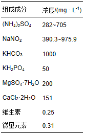 CANON工藝的啟動階段采用人工模擬高氨氮廢水.啟動完成后,利用某石化公司石油裂化催化劑生產廢水對微生物進行馴化,廢水日產量約為15.6×103 m3.模擬高氨氮廢水的水質如表 1所示(于英翠等,2012),微量元素成分見表 2.