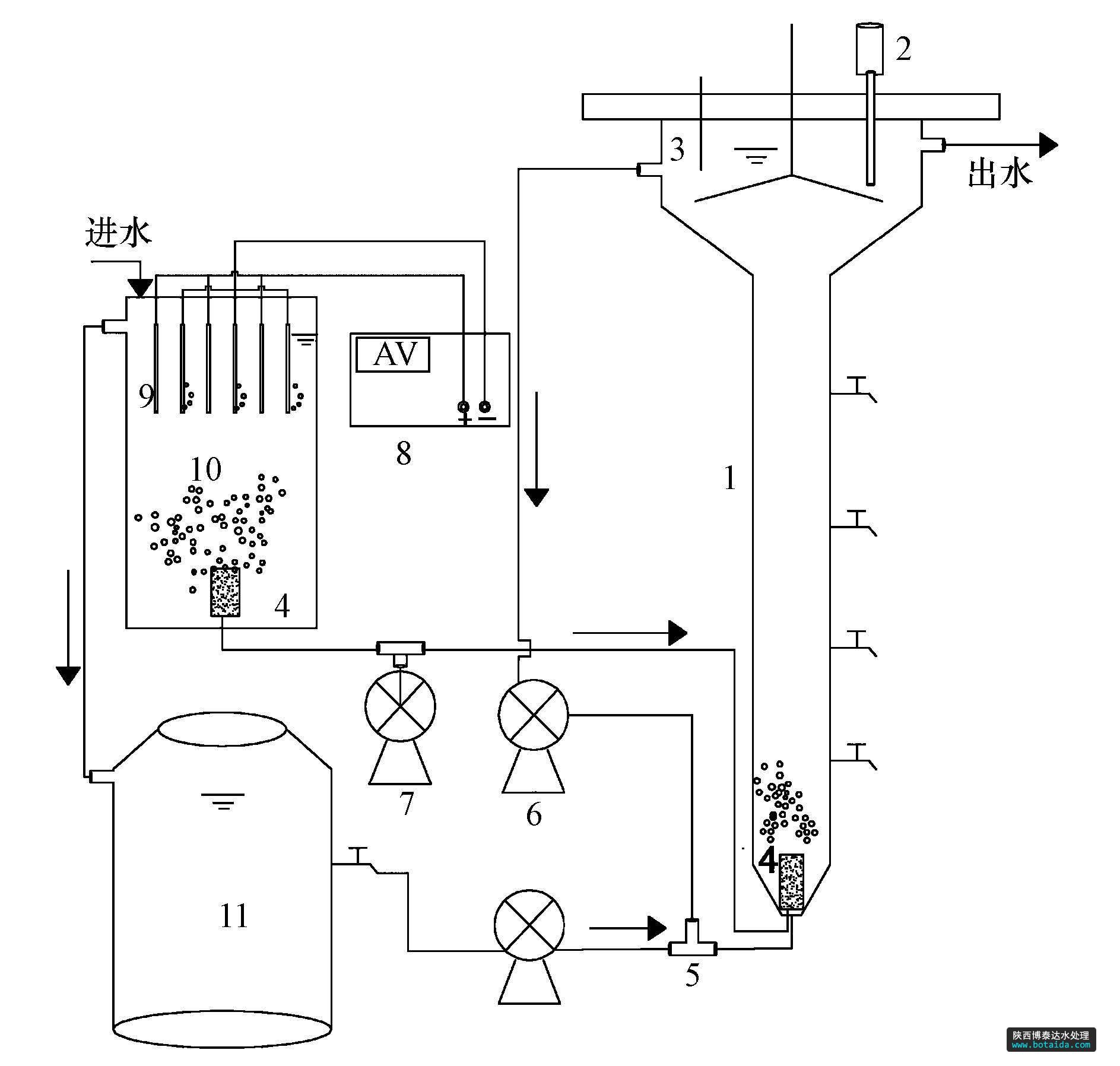 圖1 電絮凝-CANON工藝裝置示意圖(1.EGSB,2.溶解氧儀,3.溫度計,4.曝氣頭,5.三通,6.蠕動泵,7.空氣泵,8.電源,9.鋁板,10.電絮凝反應器,11.調節池)
