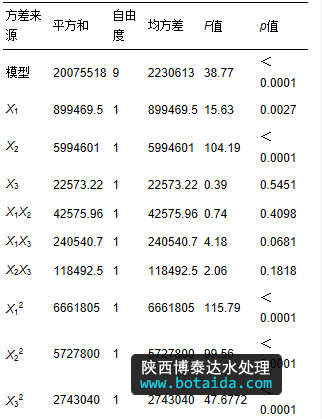同樣地,經二次多元回歸擬合和方差分析后,得到各單因素、交互項及平方項對SCOD濃度的影響情況,相應的回歸方程(4)為: