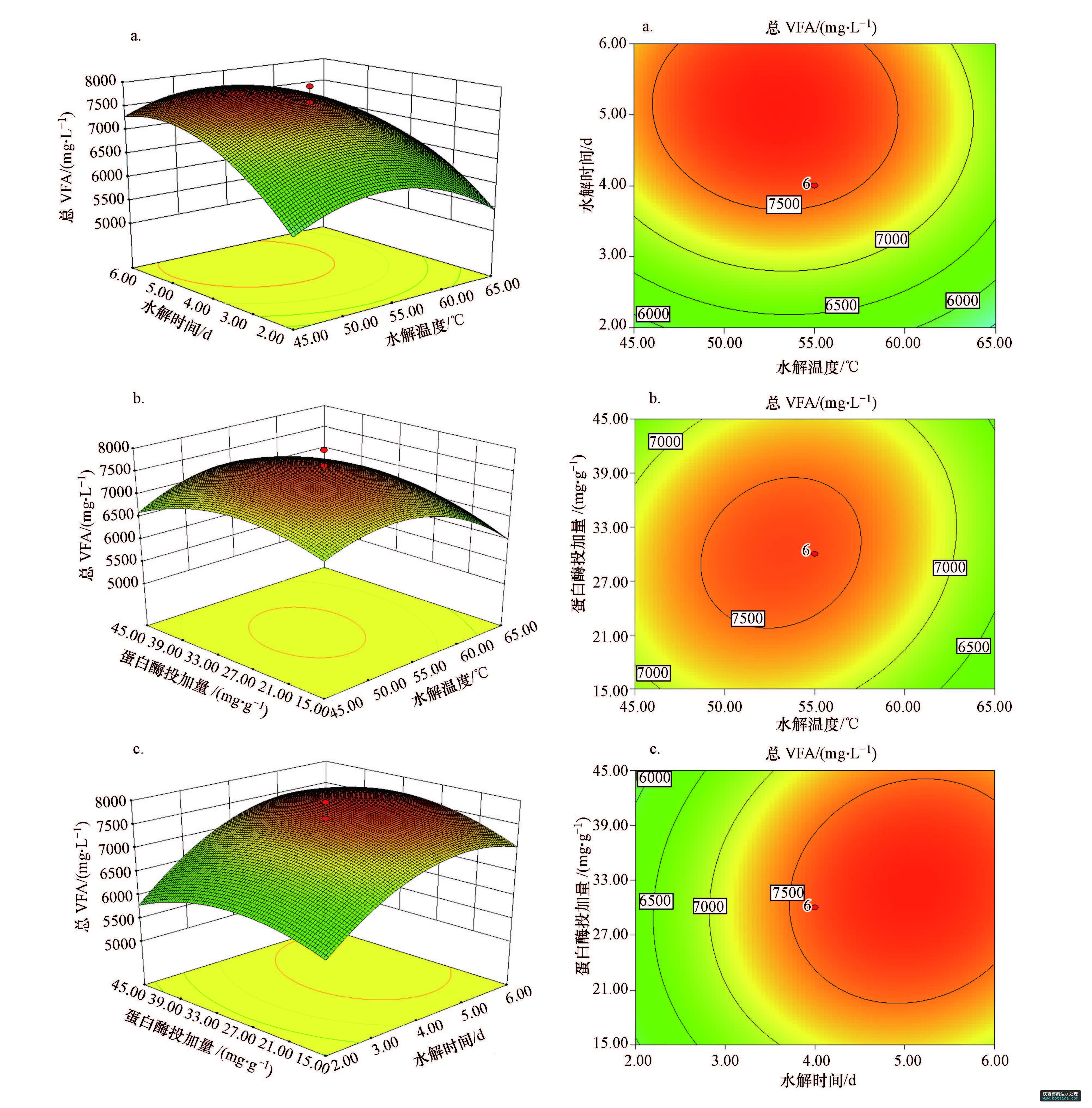 圖1 不同因素對總VFA濃度(以COD計)影響的響應曲面圖和等高線圖(a.水解酸化時間和水解溫度,b.蛋白酶投加量和水解溫度,c.蛋白酶投加量和水解酸化時間)