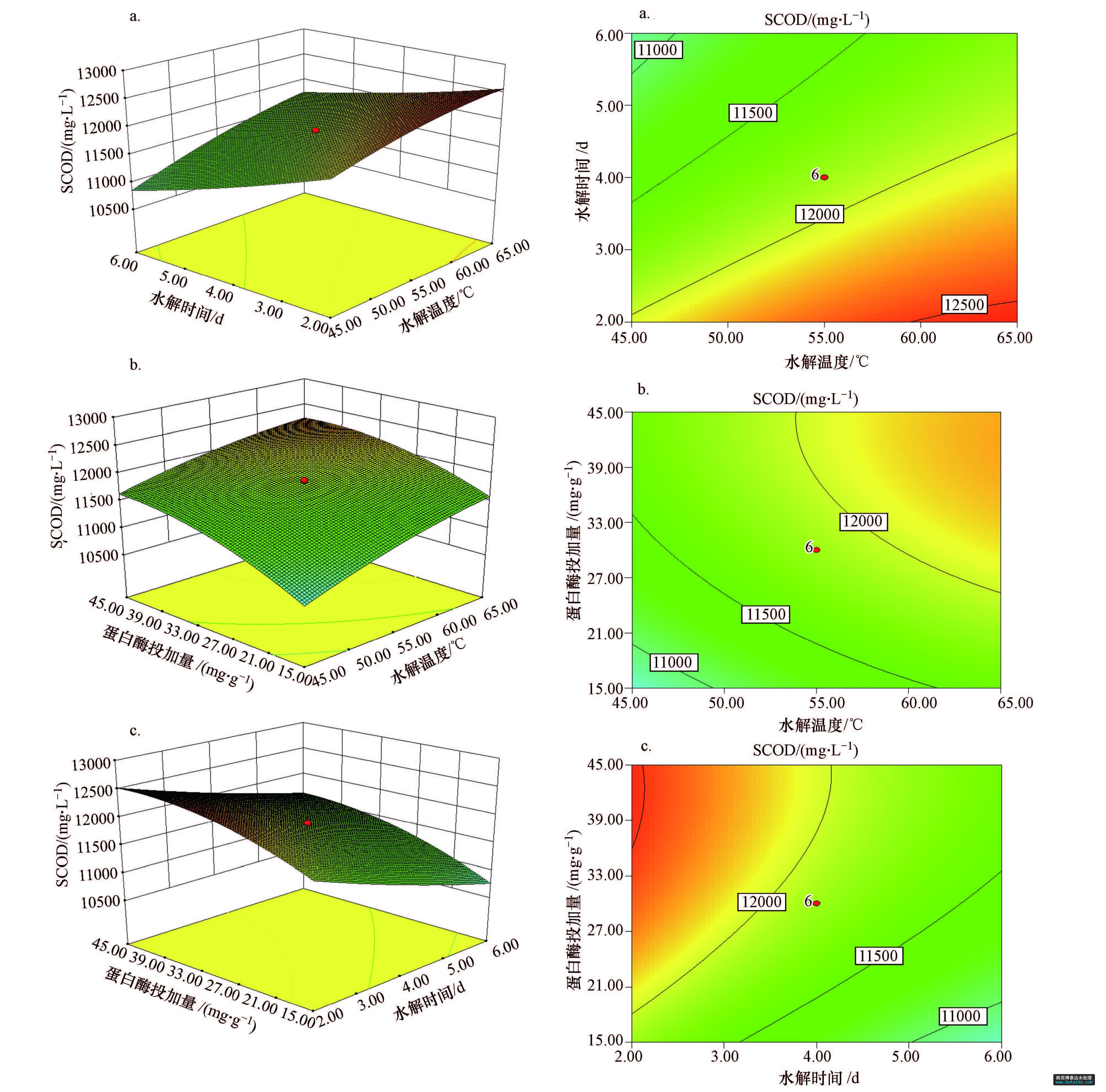 圖2 不同因素對SCOD濃度影響的響應曲面圖和等高線圖(a.水解酸化時間和水解溫度,b.蛋白酶投加量和水解溫度,c.蛋白酶投加量和水解酸化時間)