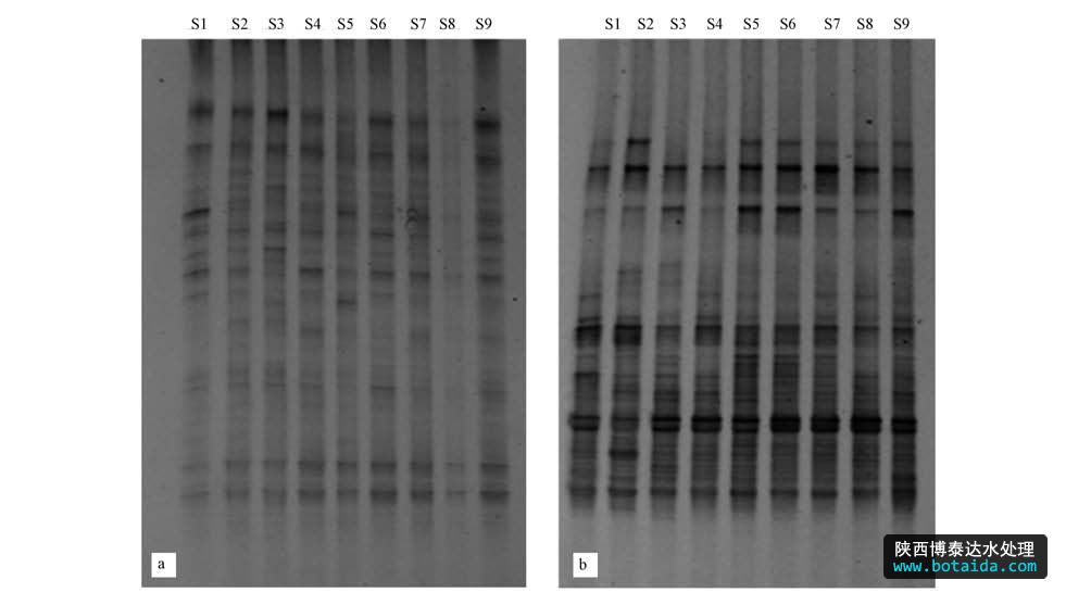 圖2 大亞灣海域浮游細(xì)菌16S rDNA V3區(qū)DNA圖譜(a. 2010年冬,b. 2011年夏)