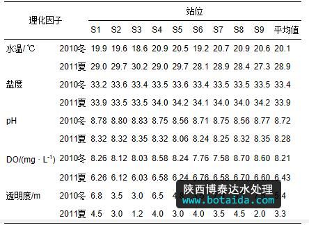 水溫、鹽度、電導(dǎo)率、溶解氧(DO)、pH值等理化因子通過采用美國YSI-561多參數(shù)水質(zhì)分析儀進(jìn)行現(xiàn)場測定,透明度用薩氏盤測定.