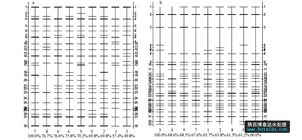 圖3 大亞灣海域浮游細(xì)菌16S rDNA V3區(qū)DGGE圖譜分析帶型圖(其中水平軸上的數(shù)字(1~9)為站點編號,百分比是與標(biāo)準(zhǔn)泳道的匹配度; 垂直軸上的數(shù)字為DNA條帶編號(a. 2010年冬,b. 2011年夏))