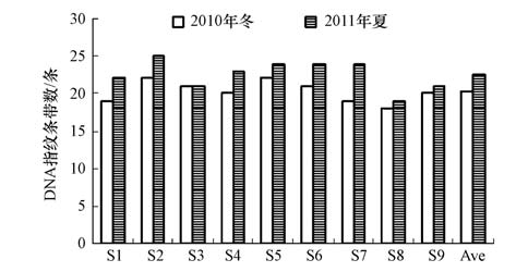 1)大亞灣海域浮游細(xì)菌DNA指紋條帶豐富,在2010年冬和2011年夏的調(diào)查中共分別得到32和33條DNA指紋條帶,每個樣品的DNA條帶數(shù)為18~25條.
