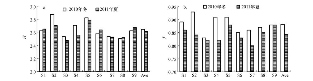 圖5 大亞灣浮游細(xì)菌DNA指紋的Shannon-Weaver多樣性指數(shù)(H′)和PieLou均勻度(J)(a. H′,b. J)