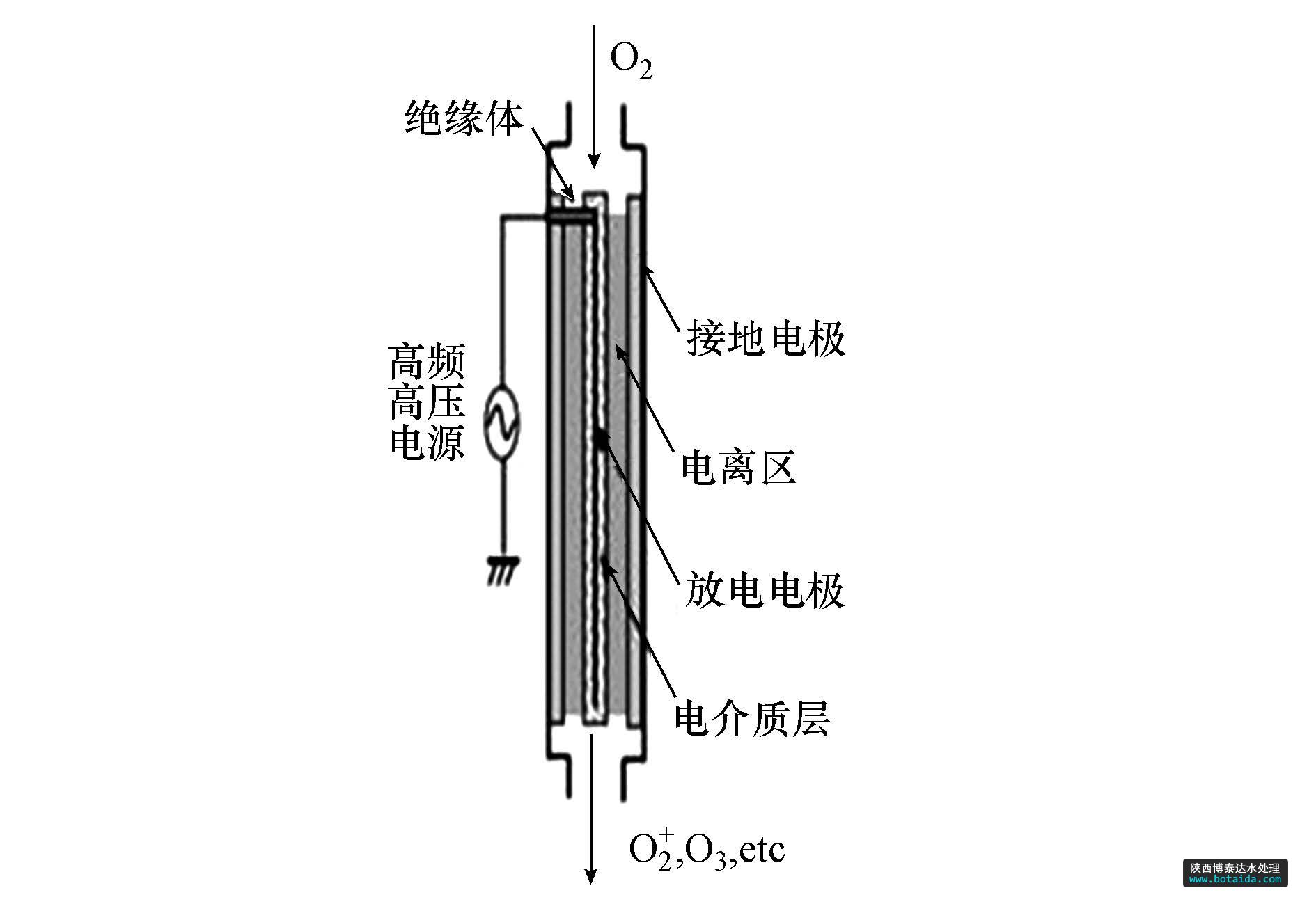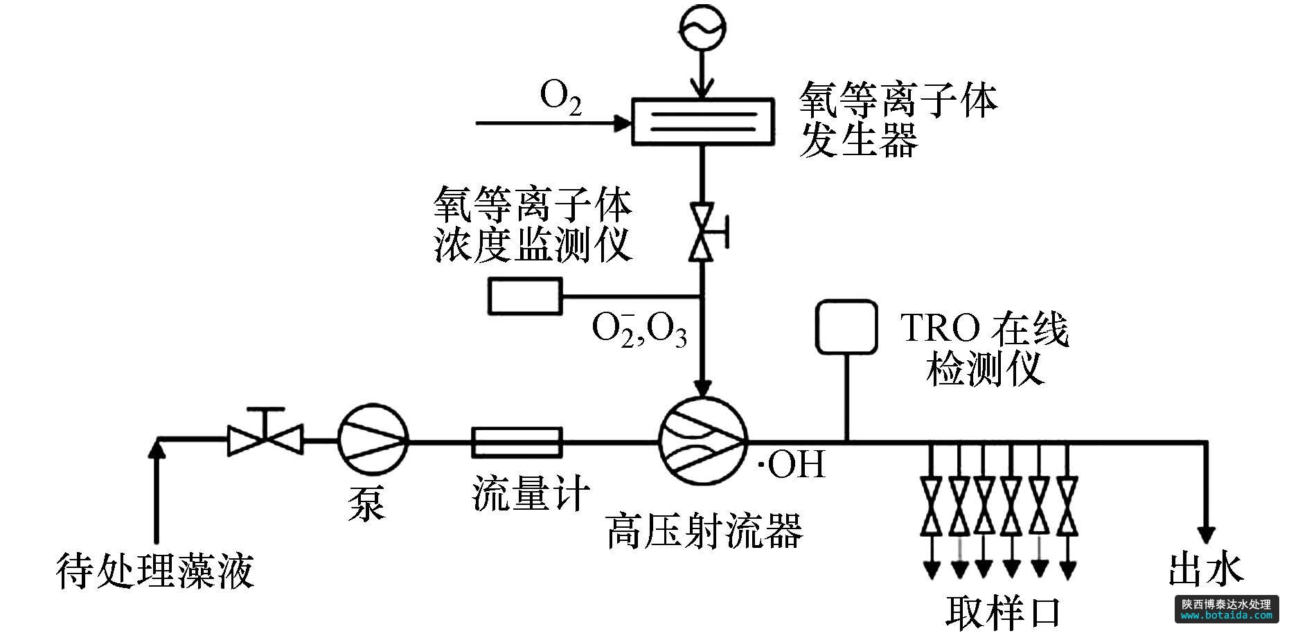 · OH處理高藻水的實驗系統如圖 1所示.待處理藻液由水泵泵入管路,進水流量為4 L · min2-1,純度為99.9%的O2通入氧等離子體發生器中(圖 2),流量為0.5 L · min-1.在大氣壓下微流注與微輝光交替協同形成的強電離放電作用下,O2被電離,生成O+、O(21D)、O、O-、O2(a21Δg)、O3等氧活性粒子;然后在高壓射流器處,經射流、空穴作用將氣態氧活性粒子高效傳質混溶于水溶液中,生成以· OH為主的氧自由基溶液,其中還包括H2O2、HO-、O2· -,
