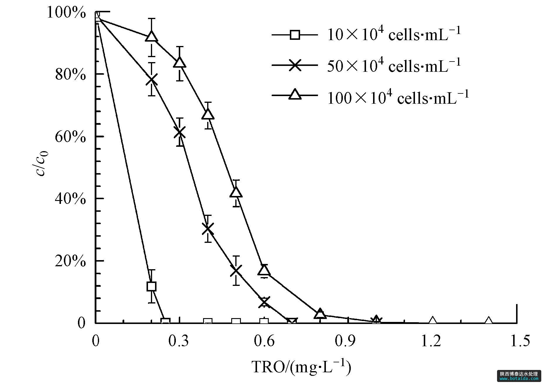 實驗中對初始藻密度分別為10×104、50×104、100×104 cells · mL-1的藻液在實驗系統中進行殺滅.對于某一藻密度的藻液,改變TRO濃度,利用熒光顯微鏡測定藻細胞的存活率(c/c0).得到不同初始藻密度的藻細胞存活率與TRO濃度的關系曲線,如圖 3所示.可看出,隨著TRO濃度的不斷升高,藻細胞存活率隨之降低;在相同的TRO濃度下,藻類的初始濃度越高,存活率越低.因此使不同的初始藻密度的藻細胞完全致死所需的TRO濃度是不同的.隨著藻液初始藻密度的升高,所需要的致死劑量也隨之升高.致死劑量由低到高分別為0.25、0.71、1.18 mg · L-1.