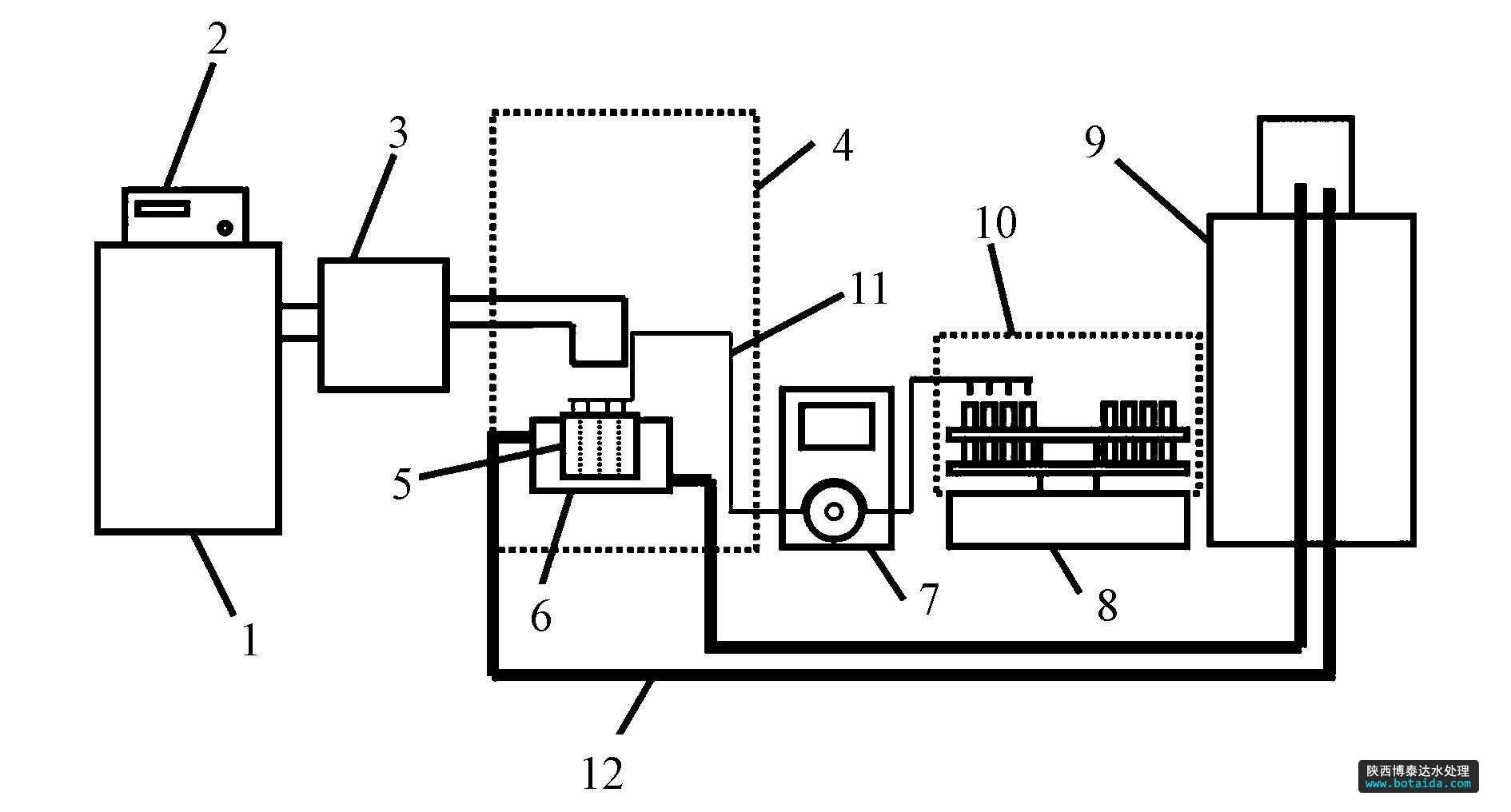 圖1 單線態氧捕獲裝置示意圖(1.光源,2.光強調節器,3.單色儀,4.暗室,5.多通量反應杯,6.冷阱,7.恒流泵,8.部分收集器,9.恒溫循環水,10.遮光罩,11.采樣管路,12冷凝水管路)