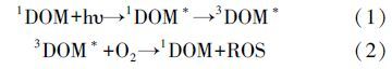 溶解性有機質(DOM)含有發色基團,是重要的天然光敏劑,在紫外輻射或太陽光照射下,單線態(state DOM singlet,1DOM)分子吸收光能先轉化為激發單線態(excited state DOM singlet,1DOM*),進而轉化為激發三線態(excited state DOM triplets,3DOM*),進一步與溶解氧分子發生一系列反應,產生活性氧物質(reactive oxygen species,ROS),如羥基自由基(hydroxyl radical,· OH)、單線態氧(singlet oxygen,1O2)、超氧化物(superoxide,O2-)等(見反應式(1)、(2.這些活性氧物質可以誘導有機污染物光降解,同時,DOM也會與目標化合物競爭光吸收,或猝滅目標化合物的激發態,DOM對有機污染物的光解具有光敏化和光屏蔽雙重作用(Chen et al., 2009;,這與DOM的來源、組成、化學結構等特點密切相關.因此,溶解性有機質在水生生態系統光化學中扮演重要角色,可以影響有機污染物的環境行為和生態風險.