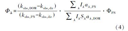 式中,Iλ表示光源在每個波長下的光照強度(W · m-2);aλ,DOM和aλ,PN分別表示腐殖酸和光敏劑在每個波長處的納氏吸收系數(m-1),可由公式(5)計算得到;Sλ是屏蔽因子,無量綱,可由公式(6)計算得到.