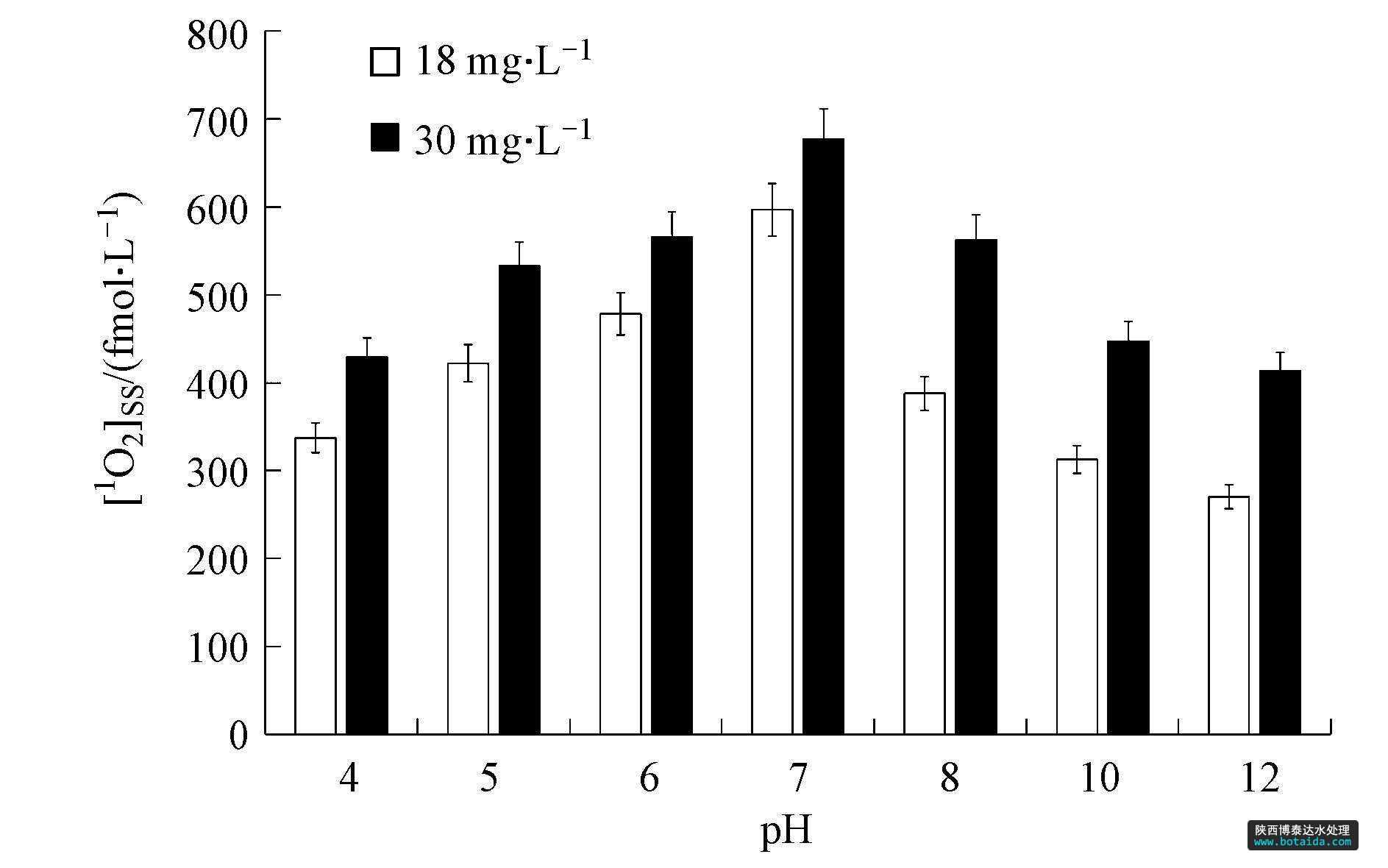 溶解性有機質濃度(DOC)是溶解性有機質產生1O2的重要影響因素,研究結果表明,[1O2]ss與DOC顯著線性相關(R2=0.95).由圖 2可知,本研究中同pH值下,DOC值高的腐殖酸溶液產生的1O2 均高于低DOC的溶液,但因未設置多個DOC濃度梯度實驗,本研究不能得到[1O2]ss與DOC的關系曲線.