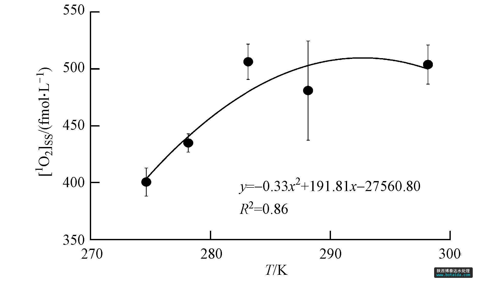為模擬實際水環境,本研究所選溫度段為1.5、5、10、15和25 ℃,[1O2]ss與T(T為絕對溫度)的關系如圖 4所示.實驗溫度范圍內,[1O2]ss值為400~506 fmol · L-1,隨T增大呈增長趨勢.分析推測溫度升高,溶液中分子活躍度增強,使得HA吸收光子能量發生能級躍遷生成三線激發態(3HA*)的速率增大,使得更多的氧分子獲得3HA*轉移的能量形成1O2.