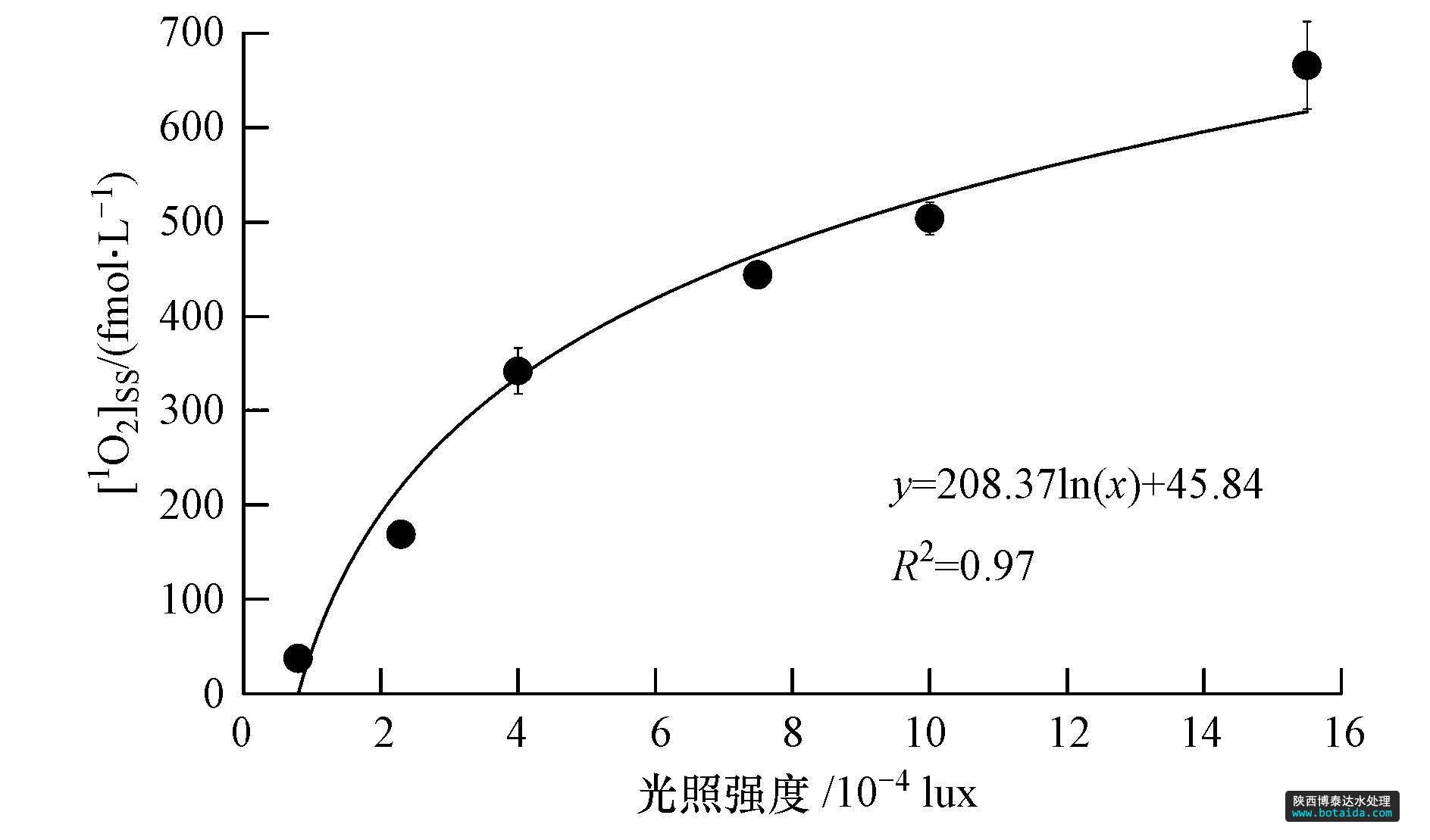 自然界直射的光照強度范圍為3.2×104到10×104 lux,本研究在此基礎上盡量模擬不同強度的太陽光,同時設置了光源光照強度最大值,評估光源的最大潛力.圖 5 為不同光照強度(0.8、2.3、4、7.5、10、15.5 ×104 lux)下,腐殖酸產生的[1O2]ss值.光強為15.5×104 lux時,[1O2]ss值達到666.1 fmol · L-1,隨著光強減弱,1O2產生速率降低,在0.8×104 lux光照下,單線態氧產生速率k與最大光強時相比低1個數量級,[1O2]ss值僅為37.3 fmol · L-1.DOM產生1O2是一個能量轉移的過程,且更依賴于365 nm左右處的紫外光子能量(Vinoe et al., 2010; Dalrymple et al., 2010).本研究中采用氙燈模擬300~800 nm波段日光輻射,365 nm處能量本身較弱,光照強度降低,使得供腐殖酸吸收的光子減少,減弱了光敏化反應.