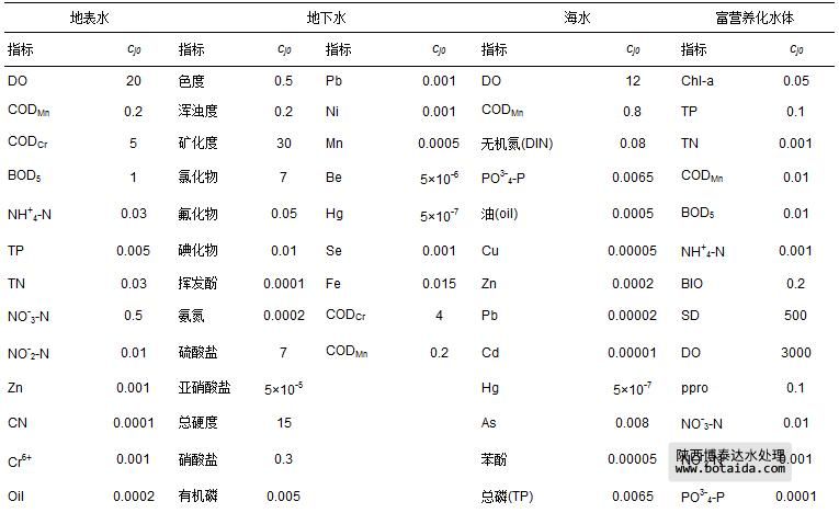 式(2)~(7)中,cj為指標j的實測值或標準值;cj0為設(shè)定的指標j的參照值,4類水體95項指標的參照值cj0和室內(nèi)、外空氣29項指標的參照值cj0分別如表 1和表 2所示.