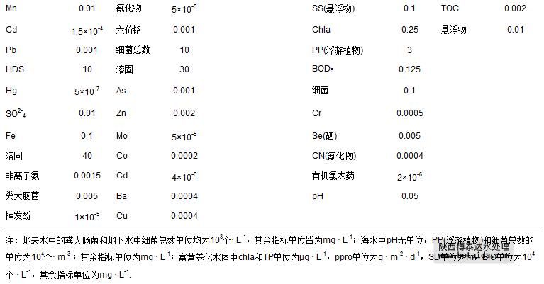 依照國家制訂的地表水環(huán)境質(zhì)量標準(GB3838— 2002)、地下水環(huán)境質(zhì)量標準(GB/14848—1993)、海水環(huán)境質(zhì)量標準(GB3097—1997)、適用于我國湖庫水體的富營養(yǎng)化標準及室外空氣環(huán)境質(zhì)量標準(GB3095—1996)和室內(nèi)空氣質(zhì)量標準(GB/T18883—2002),分別選取了4類水體的95項指標(其中,地表水、地下水、海水和富營養(yǎng)化水體分別有24項、33項、23項和15項指標)和空氣的29項指標(其中,室內(nèi)空氣15項指標和室外空氣7項指標的年、日2種不同分級標準情形)作為水環(huán)境和空氣環(huán)境的評價指標體系.