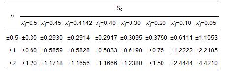 -1≈0.4142時,Sc有極小值0.5828n.由于變換式(2)~(7)中,對多數(shù)指標只取n=±2、±1、±0.5.而公式(10)和式(11)中,x′j 取值范圍為x′j∈[0,0.5](對水體),x′j∈[0,0.4](對空氣).當n為上述值時,x′j 分別取為如表 4所示值時,由式(21)計算得靈敏度Sc值如表 4所示.