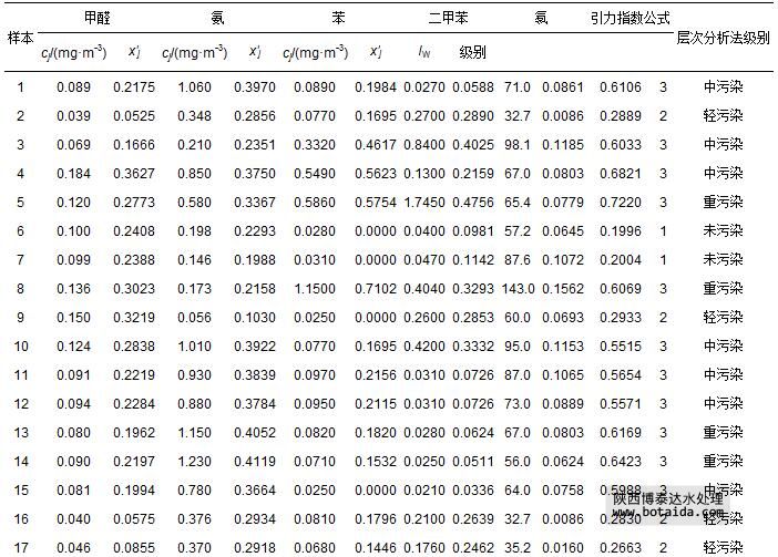 2002年11—12月長春市30個室內(nèi)樣本5項指標監(jiān)測數(shù)據(jù)cj(湯紅巖等,2005),以及由式(1)和式(7)計算出的指標規(guī)范值x′j如表 11所示.由于樣本1、11~15、26和27的不同指標計算得到的規(guī)范值相差較大,因此,在用式(12)計算引力綜合指數(shù)時,需用式(13)對引力指數(shù)值進行加權(quán)計算,其余22個樣本的指標視作等權(quán),計算得到各樣本引力綜合指數(shù)值,并根據(jù)表 3中空氣環(huán)境質(zhì)量引力指數(shù)分級標準做出評價結(jié)果(表 11).表中還列出文獻(湯紅巖等,2005)中用層次分析評價法做出的評價結(jié)果.由于文獻(湯紅巖等,2005)中的層次分析評價法將室內(nèi)空氣污染劃分為清潔(1*級)、未污染(2*級)、輕污染(3*級)、中污染(4*級)和重污染(5*級)等5級;而本文引力指數(shù)法將其劃分為1級、2級、3級.二者對應(yīng)關(guān)系為:(1*級清潔、2*級未污染)對應(yīng)1級,(3*級輕污染)對應(yīng)2級,(4*級中污染、5*級重污染)對應(yīng)3級.由表 11可以看出,二種方法評價結(jié)果完全一致.