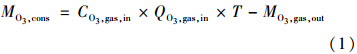 式中,MO3,cons為臭氧消耗量(mg);CO3,gas,in為反應器入口的臭氧濃度(mg · L-1);QO3,gas,in為臭氧氣體流速(L · min-1),由氣體流量計測得;T為活性污泥臭氧氧化時間(min);MO3,gas,out為未參與反應的臭氧量(mg).
