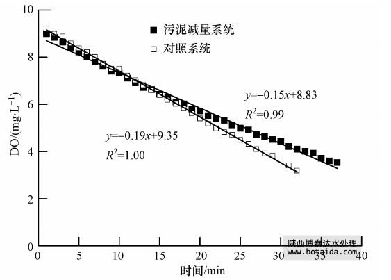 圖 6為活性污泥的耗氧速率曲線,根據耗氧速率和MLSS得到活性污泥的比耗氧速率SOUR.臭氧污泥減量系統的SOUR約為0.19 mg · g-1 · min-1(以SS計),對照系統的SOUR約為0.23 mg · g-1 · min-1,二者相差不大,表明臭氧處理后的污泥回流對生物系統的生物活性影響并不顯著.兩系統活性污泥SVI很接近,大約為82 mL · g-1,表明兩系統中活性污泥的沉降性能良好.