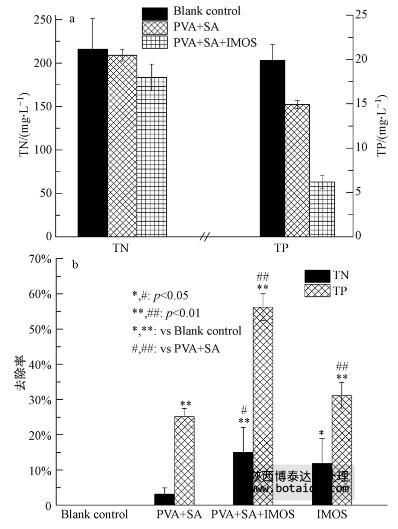 根據(jù)賴(lài)子尼等(2008)的實(shí)驗(yàn)配方制備的固定化聚磷微生物小球的彈性與機(jī)械強(qiáng)度較好,對(duì)含氮磷廢水的凈化效果表明,菌球?qū)α子休^強(qiáng)的去除能力(從(19.91±1.81)mg · L-1 降至(6.19±0.76)mg · L-1),同時(shí)能夠去除一定的氮(從(215.82±35.29)mg · L-1 降至(183.42±15.35)mg · L-1)(圖 10 a). 二者的去除率分別達(dá)56.21%和15.01%(圖 10 b). 其中,固定化材料對(duì)氮的吸附比例較小,而對(duì)磷的吸附較顯著(p<0.01),這可能與固定化材料的表面官能團(tuán)及CaCl2等對(duì)PO3-4的親和力強(qiáng)于NO-3有關(guān). 同時(shí),固定化微生物(IMOs)對(duì)磷的去除效果也優(yōu)于氮,說(shuō)明菌株ED-12可能不具備反硝化能力,對(duì)氮的利用僅是生長(zhǎng)所需. 由PVA+SA+IMOs組與PVA+SA組比較可知(圖 10b,#表示),無(wú)論是氮還是磷,都存在顯著差異,說(shuō)明固定化微生物是氮磷去除的主要貢獻(xiàn)者.