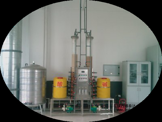 混床是混合離子交換柱的簡稱,是針對離子交換技術所設計的設備。所謂混床,就是把一定比例的陽、陰離子交換樹脂混合裝填于同一交換裝置中,對流體中的離子進行交換、脫除。由于陽樹脂的比重比陰樹脂大,所以在混床內陰樹脂在上陽樹脂在下。一般陽、陰樹脂裝填的比例為1:2,也有裝填比例為1:1.5的,可按不同樹脂酌情考慮選擇。混床也分為體內同步再生式混床和體外再生式混床。同步再生式混床在運行及整個再生過程均在混床內進行,再生時樹脂不移出設備以外,且陽、陰樹脂同時再生,因此所需附屬設備少,操作簡便。