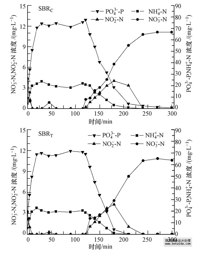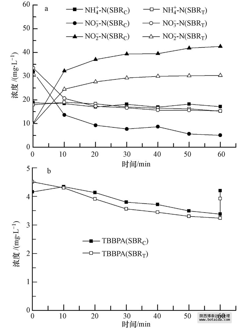 兩套SBR反應器穩定運行狀態下,出水乙酸鈉和亞硝酸鹽濃度低于檢測方法的檢出限,出水PO3-4-P,NH+4-N濃度均小于0.5 mg · L-1,反應器具有良好的脫氮除磷功能;SBRC反應器出水NO-3-N濃度為(12.9±2.2)mg · L-1,SBRT反應器出水NO-3-N濃度為(15.3±2.0)mg · L-1.表明TBBPA對SBR反應器硝化和除磷效率沒有太大影響,但對出水硝態氮濃度略有影響.