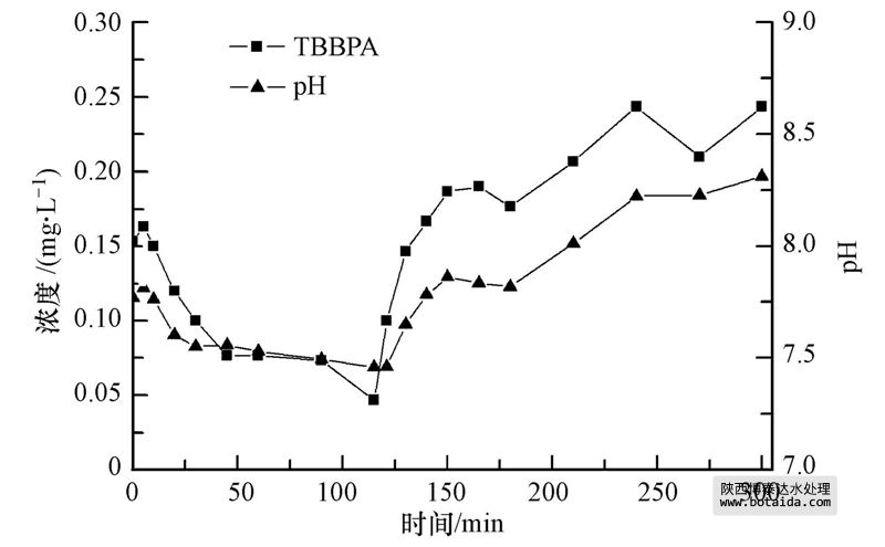 在對SBRT反應周期內TBBPA的濃度和pH進行相關性分析時,TBBPA的濃度跟pH有一定線性相關性,相關系數r為0.94.由圖 3所示,厭氧階段,由于強化生物除磷攝取有機物等反應,pH有所降低;TBBPA的濃度隨著pH的降低而下降,厭氧結束時TBBPA濃度達到最低0.05 mg · L-1.曝氣開始后,由于曝氣導致二氧化碳等吹脫,pH升高,TBBPA濃度隨著pH的升高而升高.TBBPA隨著pH變化的原因為TBBPA的溶解度受pH影響較大,當pH小于7.5時,TBBPA溶解度很低而主要被活性污泥吸附,而pH增加到8時,TBBPA的溶解度急劇上升,表現為溶液中TBBPA濃度的增加.