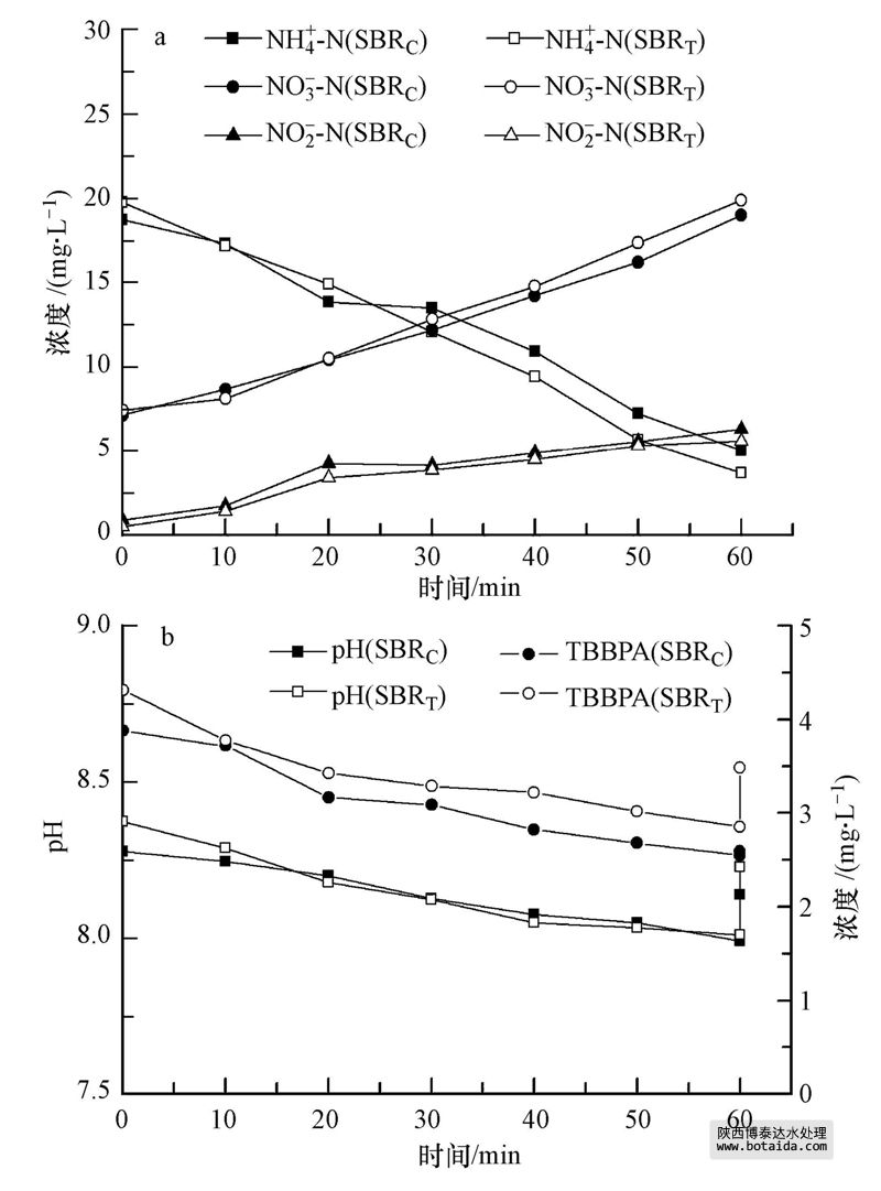 本研究采用實驗室序批式活性污泥反應器(sequencing batch reactor activated sludge process,SBR),研究TBBPA在工藝中的去除,尤其關注其在SBR典型周期內的變化特征,以及TBBPA在硝化反硝化過程中的去除特性和相關機理.