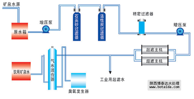 礦泉水源→原水箱→原水增壓泵→石英砂過濾器→活性炭過濾器→精密過濾器→高壓泵→超濾主機→工業用超濾水→臭氧發生器→氣水混合器→飲用礦泉水如需要產品及技術服務,請撥打服務熱線:13659219533